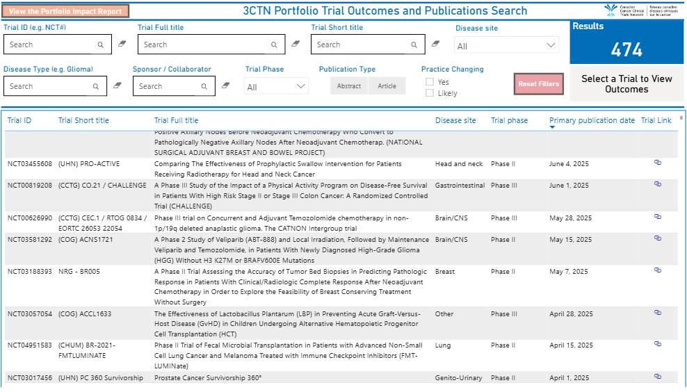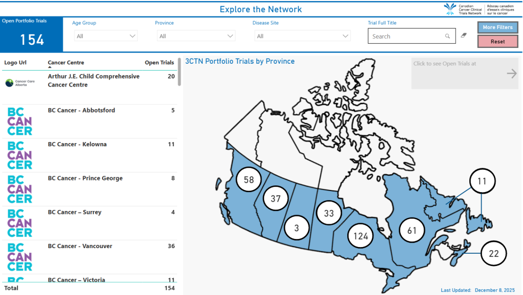 3CTN, with support from EDGE, University of Southampton, created the Canadian Cancer Trial Finder which consolidated Network data from existing solid tumour trial maps and leveraged use of an available Application Programming Interface (API) for improving the efficiency and capacity of regular updates from clinicaltrials.gov that has enabled inclusion of all active academic- and industry-sponsored trials at Canadian sites.