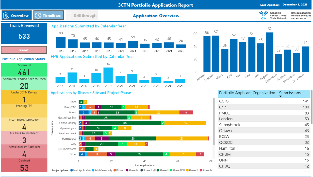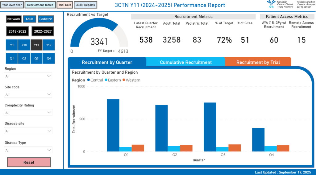 This year has seen sustained rates for new academic cancer clinical trials (ACCTs) added to the 3CTN Portfolio and activated across centres in comparison with the past year. While this signals continued post-pandemic recovery, there has been an observed plateauing of overall recruitment rates, owing in part to trial designs involving more targeted therapies for smaller patient populations. Our capacity to monitor trends such as this in the Canadian trial environment will be invaluable for adapting go-forward accrual strategies and targets.