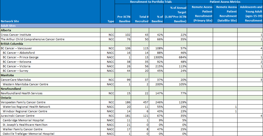 | Manitoba | 2 | – Developed adolescent and young adult (AYA) strategy to pilot with an upcoming clinical trial – Recruited first patient within site target |